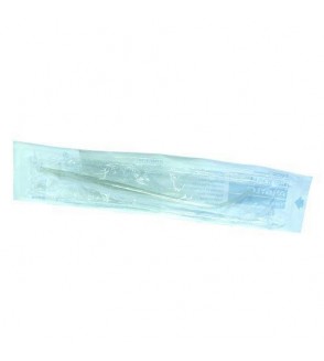 Cánula de aspiración. Su forma posibilita la aspiración en espacios reducidos. Al ser de plástico, puede ser utilizada en electrocirugía, al contrario que las cánulas metálicas.