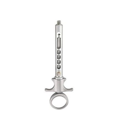 Jeringa ergonomica en acero inoxidable, para cartuchos de anestesia de uso dental con sistema de aspiración. Jeringa (auto-aspirante) para prueba fiable de aspiración antes de la inyección. Tiene capacidad para cartuchos de 1,7/1,8 ml. EL tamaño pequeño ha sido diseñado especificamente para ser manipulado por manos pequeñas, con el agarre de anillo pulgar y adaptado para garantizar siempre el mejor control durante la inyección.